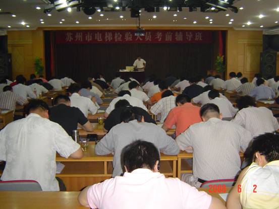 今年苏州电梯制造单位、安装改造维修单位到期换证的企业较多,因此要求领检验人员证的单位和人员也较多,为了帮助企业如期换证,方便企业检验人员参加培训。在我局积极向江苏省质量技术监督局、江苏省特种设备管理协会争取后,电梯检验人员培训班最终得以在苏州举办。2008年5月29日至6月2日,有36家电梯制造、安装改造维修单位共135人参加的电梯检验人员培训班在苏州苏盛宾馆举办。 本次培训班得到了苏州质监局特设处领导的高度重视,苏州质监局特设处邢东生处长、江苏省特种设备安全监督检验研究院苏州分院高级检验师陈驰及相关专业人员讲解电梯安全方面的法律法规标准、电梯基础知识以及电梯质检工作要点。2008年6月2日,江苏省特种设备管理协会特地派卢艳梅从南京赶来苏州监督本次检验人员培训班的培训考核情况。通过本次检验人员培训班使参加人员加深了对电梯的基础知识的理解、掌握了电梯检验的工作要点,同时从很大程度上解决了生产单位许可证到期换证的需求。